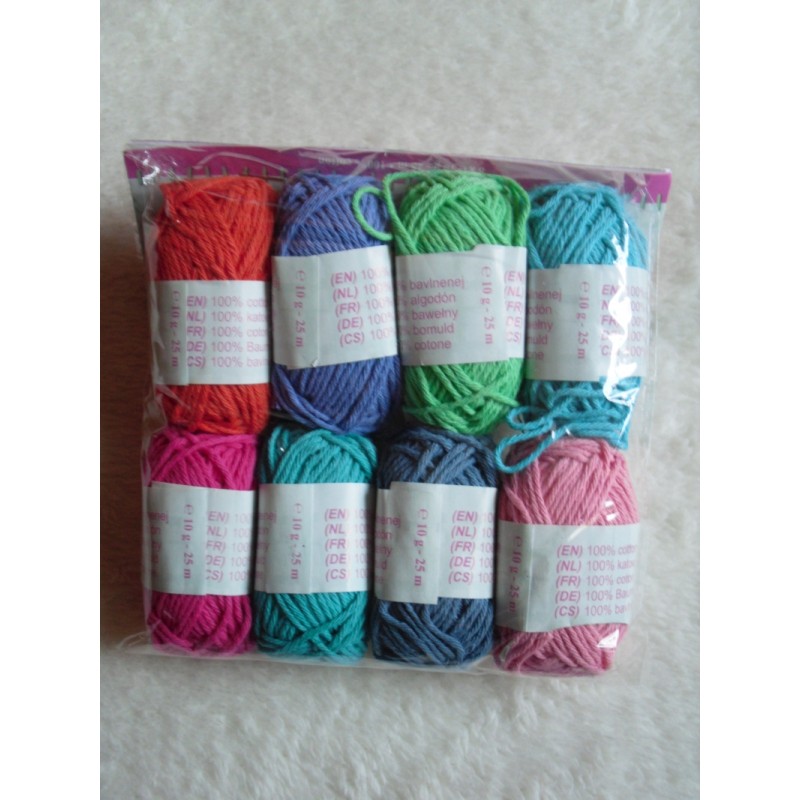 Für bunte kleine spontane Häkel- oder Strickideen (zB. Schlüsseltäschchen) sind diese Packungen mit 8 verschiedenen Farbkombinationen gedacht. Jedes Knäuel hat 10 gr bzw. 25 Meter reines Baumwollgarn, gedacht für Nadelstärke 3 - 4.
